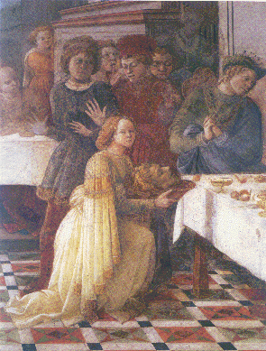 Fra Lippo Lippi. Scenes from the Life of John the Baptist: Herod's Banquet. Detail: Salome presents the head of John the Baptist. Prato, Cathedral. (Gloria Fossi. Felippo Lippi. Florence: Scala, 1990. pl. 67).