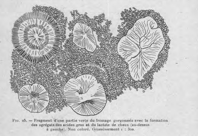 Professor Otakar Laxa (pictured), of the University of Chemical Technology in Prague, conducted extensive microscopic studies of cheese that included many mentions and sketches of crystals. Laxa noted the presence of leucine, tyrosine, and lactate of lime (calcium lactate) across many different cheese varieties; crystals appeared to be endemic in alpine-style cheeses, grana-style cheeses, blue cheeses, and others. Pictured are a few of his sketches. Image credit