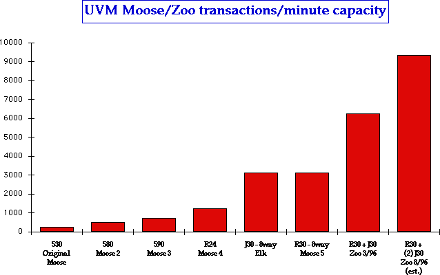 This system (dubbed "Moose" by the staff members who first installed it) proved to be very popular with students and faculty, especially as an email and Internet access host. And when funding for the UVMGIS VAX host expired shortly after, Moose also becam e the new home for geographic information systems research and instruction. In order to keep up with the growing demands, CIT has steadily increased the power of Moose, replacing the 530 with a 580 in 1993, which was replaced with a 590 in 1994 and with a n R24 in January, 1995. (See attached chart for relative capacity.) During this period the number of users had increased from a few hundred to well over 10,000 and was projected to increase by several thousand more by fall (currently about 14,000). By the spring of 1995 it became clear that though this was the most powerful RS6000 uniprocessor available at the time, it was not going to be able to keep up with the anticipated growth of demand. Since purchasing a more powerful system was not an option, seve ral alternatives were considered. A few of the more viable possibilities that were evaluated, but not chosen, were: