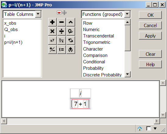 Right click on the top cell of Column 4 and select "Formula" (or you can click the top cell to highlight the column and select "Formula" from the "Cols" menu). Select "i" from the left column "division" from the keypad and then 7+1 in the denominator, then click "ok".