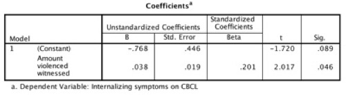 Note that, as hypothesized, the correlation matrix shows a relationship between witnessing violence and later internalizing symptoms. The correlation (r = .20) was significant at p < .05. Thus we can conclude that there is a linear relationship between the degree to which children witness violence, and their level of internalizing symptoms. Whether or not this is a direct causal relationship is the next question.