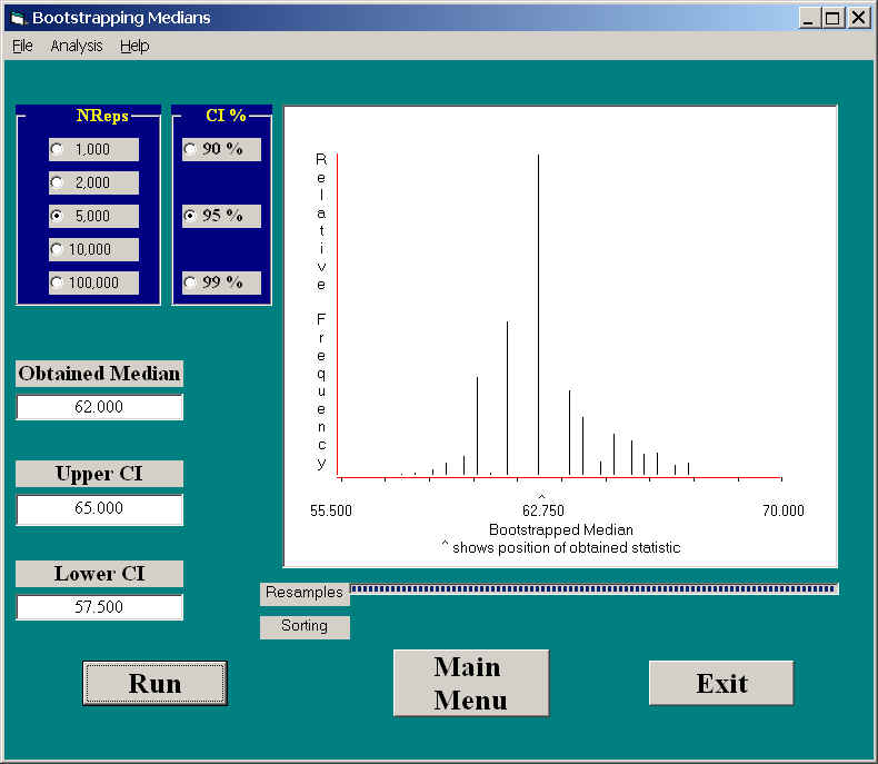 Much of what I need to say about bootstrapping medians has already been said in the section on bootstrapping means. The procedures for bootstrapping almost any statistic follow a very predictable pattern, and I am not going to repeat much of that here. The only method that I have programmed as of the time of this original writing is "Lunneborg's" method.