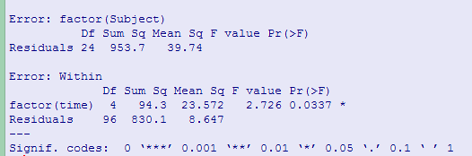 We can apply a randomization test to these data using the code shown below. This code may be harder to read than most. That is because I had a lot of trouble coming up with a way of randomizing the time measurements within subjects. I finally did it, but it takes a bit of thinking. The code also produces a standard analysis of variance table. The "Error: factor(Subject)" section just tells you about the variability among subjects, which is not particularly interesting. The "Error:Within" section tests the time (or trials) factor and is what we mainly want.