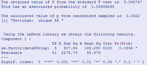 Notice that our sample F is the same, as it should be, and the associated p is .033. This agrees closely with the unadjusted p value for the F. It does not agree, however, with either of the adjusted p values (not shown). Here we have a situation where the p computed from the randomization test would allow us to reject the null hypothesis of no difference, but the p computed from the appropriate adjustment of Greenhouse and Geisser would not allow rejection.