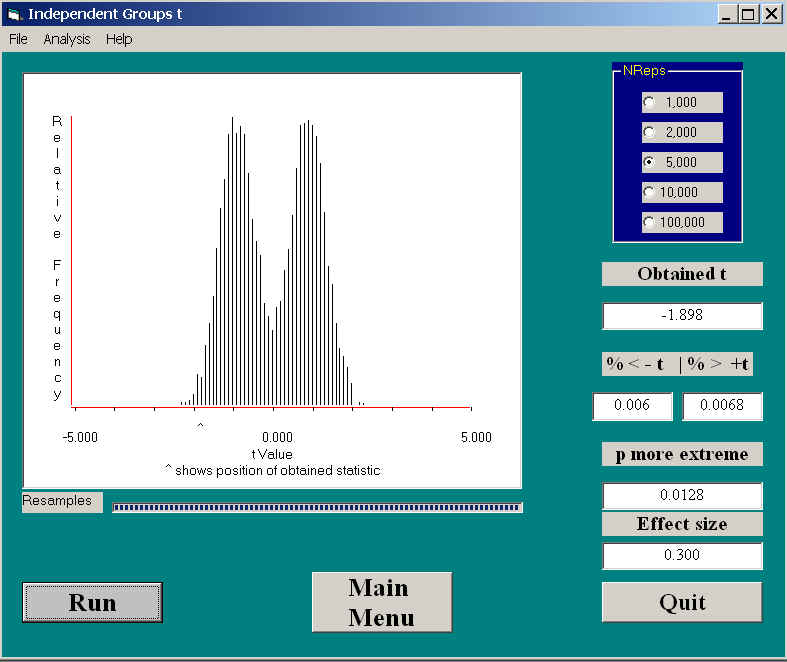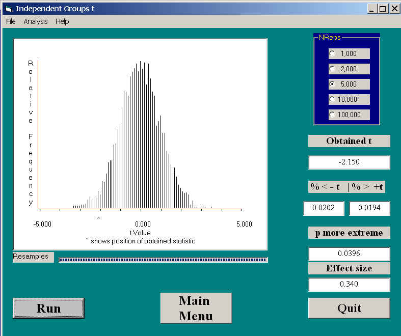 Another unusual thing is that the obtained value of t is -1.898, well below the traditional cutoff point for a significant t. Yet, when we look at the results, the actual probability is 0.0128, which is significant. This is a nice illustration that the sampling distribution of t calculated from a randomization test is sometimes quite different from the usual t distribution. Not only is the shape different here, but the critical value is quite a bit smaller.