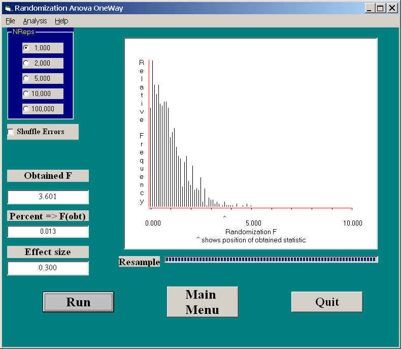 Here you can see the sampling distribution of F, which, in this case, looks very much like the tabled sampling distribution. You can see an F = 3.046, which is exactly the same as the F you would have from any standard analysis of variance program. The associated p value is .038. This is obtained by noting the number of resamplings with an F greater than 3.046. It happens to agree well with the probability obtained from the standard F distribution on 3 and 41 degrees of freedom, but that need not always be the case.