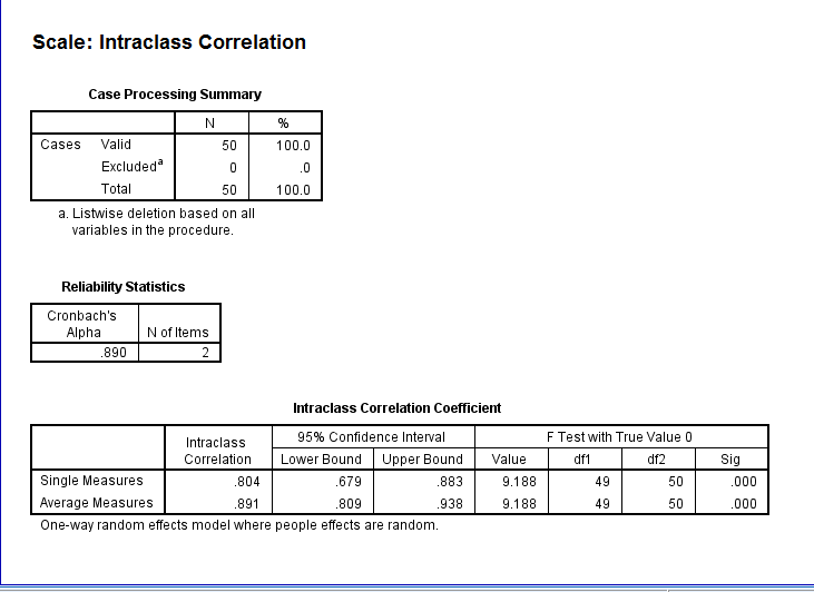 Here you can see that the intraclass correlation agrees perfectly with the measure that we calculated (.804). The "Average Measure Intraclass Correlation" is not relevant to this particular problem. It represents our estimate of the reliability if we averaged the scores of the two partners, and used that as a variable. It can be obtained directly from the intraclass correlation coefficient by using the Spearman-Brown Prophecy formula (rSB = [(2*ricc)/(1+ricc)].