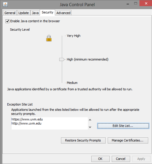 Notice that near the bottom is an "Exception List," with "http://www.uvm.edu" and "https://www.uvm.edu." You can add the same exceptions that I have by clicking on "Edit Site List ..." Put those exceptions in and click OK. You should now be all set to run. (I use both "http://" and "https://" because you can get to this page in different ways and some may not use the more secure https setting.) When you start Java by clicking on one of the Java Apps (e.g. "Why Divide by N - 1?"), it will ask if you still want to run the app. Click "Run." and you are all set. (If you have already got Java or your browser running, close it and then reopen it after adding the exception.)