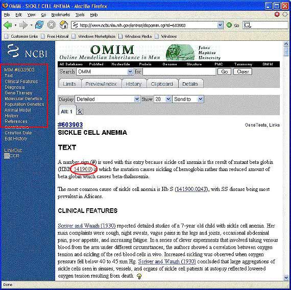 The search terms are ranked by statistical relevance to the query. The two accession numbers in red correspond to records which describe the symptoms of the disease (#603903), and information about the protein which causes the disease, the b chain of hemoglobin (+141900). |