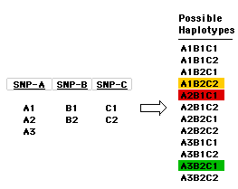 Haplotypes. Even SNPs which have no effect on function, may still be useful as “tags” for the multiple genes associated with such complex diseases as cancer, diabetes, vascular disease, and some forms of mental illness. These associations are difficult to establish with conventional gene-hunting methods because a single altered gene may make only a small contribution to the disease. However, SNPs can be used as markers to locate genes on chromosomes, and this leads to the “International HapMap Project”. If there are 1 x 107 SNPs distributed across 23 chromosomes, there are approximately 500,000 SNPs / average chromosome. Some SNPs are so close to each other that they will tend to be inherited together as a block. Although the current terminology is slightly ambiguous, for the purposes of this tutorial a set of SNPs which are clustered together at a particular location on a single chromosome will be said to form a haplotype block. Since SNPs are by definition polymorphic, different SNP alleles will result in different haplotypes (variants of a haplotype block). For example, suppose: